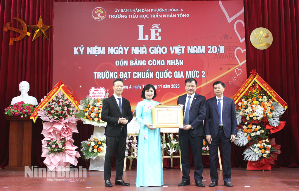 Tại buổi lễ, đồng chí Phó Chủ tịch HĐND tỉnh Mai Thanh Long và đồng chí Bí thư Đảng ủy phường Đông A Nguyễn Xuân Hồng đã trao Bằng khen của Chủ tịch UBND tỉnh cho tập thể nhà trường; tặng lẵng hoa tươi thắm chúc mừng thầy và trò nhà trường. Lãnh đạo UBND phường Đông A trao Bằng công nhận trường đạt chuẩn quốc gia mức độ II, Kiểm định chất lượng giáo dục mức độ 3 cho Trường Tiểu học Trần Nhân Tông.