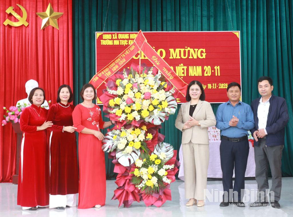 Đồng chí Trần Thị Định, Bí thư Đảng ủy, Chủ tịch HĐND xã Quang Hưng đã gửi lời chúc mừng Ban Giám hiệu, các thầy, cô giáo, cán bộ, công chức, viên chức nhà trường nhân dịp kỷ niệm Ngày Nhà giáo Việt Nam; đồng thời mong muốn Ban Giám hiệu, các thầy, cô giáo, cán bộ, công chức, viên chức nhà trường tiếp tục phát huy tinh thần sáng tạo, đạt được nhiều thành tích xuất sắc trong năm học, đóng góp tích cực vào sự nghiệp phát triển giáo dục của tỉnh nhà.