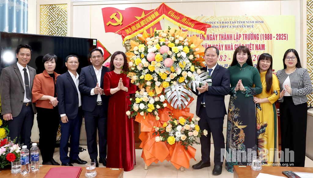 Đồng chí Đinh Văn Khâm, Phó Giám đốc Sở Giáo dục và Đào tạo tặng hoa chúc mừng Trường THPT A Nguyễn Huệ (phường Tam Điệp).