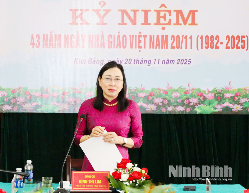 Phát biểu tại lễ kỷ niệm, đồng chí Đinh Thị Lụa, Phó Bí thư Thường trực Tỉnh ủy ghi nhận, biểu dương thành tích của nhà trường trong năm học vừa qua và trân trọng cảm ơn những đóng góp, cống hiến của các thế hệ thầy cô giáo, cán bộ, nhân viên và học sinh nhà trường. Đồng chí nhấn mạnh, năm học 2025 – 2026 là năm học có ý nghĩa đặc biệt quan trọng, là năm học đầu tiên triển khai thực hiện Nghị quyết số 71-NQ/TW ngày 22/8/2025 của Bộ Chính trị về đột phá phát triển GD&ĐT. Đây cũng là năm đầu tiên thực hiện Nghị quyết Đại hội đại biểu Đảng bộ tỉnh Ninh Bình lần thứ I, nhiệm kỳ 2025 – 2030, trong bối cảnh vận hành chính quyền địa phương hai cấp, mở ra chặng đường mới đầy triển vọng trong quản lý và tổ chức hoạt động giáo dục.