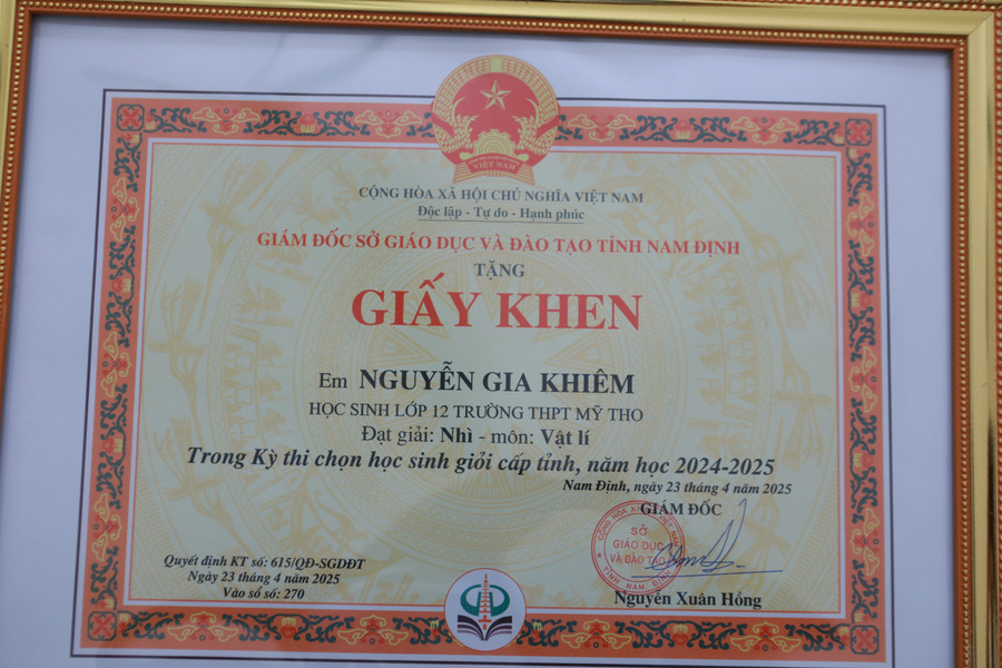 Thông tin tới Báo Giáo dục và Thời đại, TS Hà Văn Hải – Hiệu trưởng Trường THPT Mỹ Tho (Ninh Bình) cho biết, Kỳ thi tốt nghiệp THPT năm 2025, nhà trường có nhiều học sinh đạt kết quả cao. Toàn trường có 11 bài thi đạt điểm 10. Môn Vật lí có 9 học sinh đạt điểm tuyệt đối; 1 em đạt 10 điểm môn Hóa học và 1 thí sinh giành điểm 10 môn Địa lí.