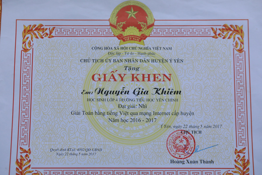 Hoàn cảnh gia đình khó khăn là vậy, nhưng Khiêm luôn có ý chí phấn đấu vươn lên trong học tập với nỗ lực không mệt mỏi. Với năng lực học tập tốt nên em đã đạt được rất nhiều thành tích đáng khích lệ.