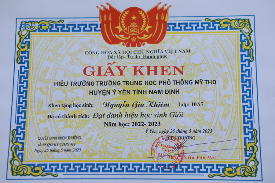 Một số giấy khen, thành tích tiêu biểu của em Nguyễn Gia Khiêm trong 3 năm học tại Trường THPT Mỹ Tho. Ảnh: Đình Tuệ.