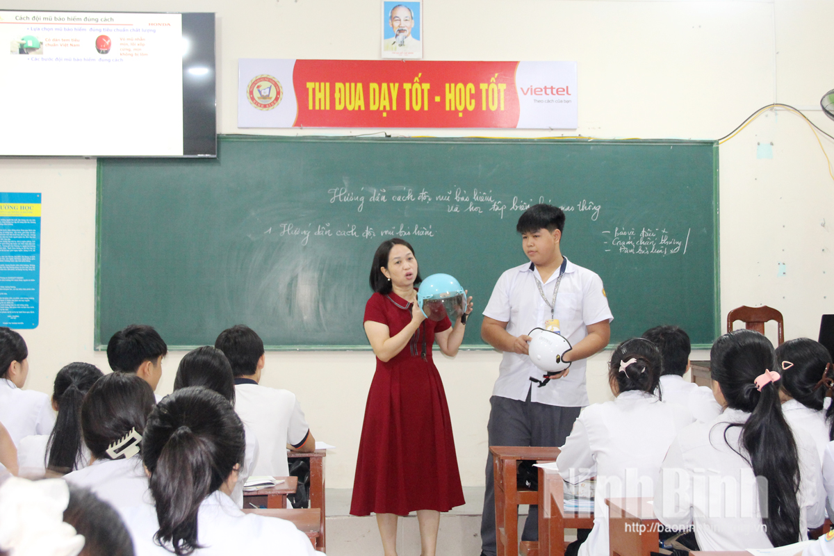 Một tiết học hướng dẫn cách đội mũ bảo hiểm đúng quy định tại Trường THPT Lý Nhân (xã Vĩnh Trụ).