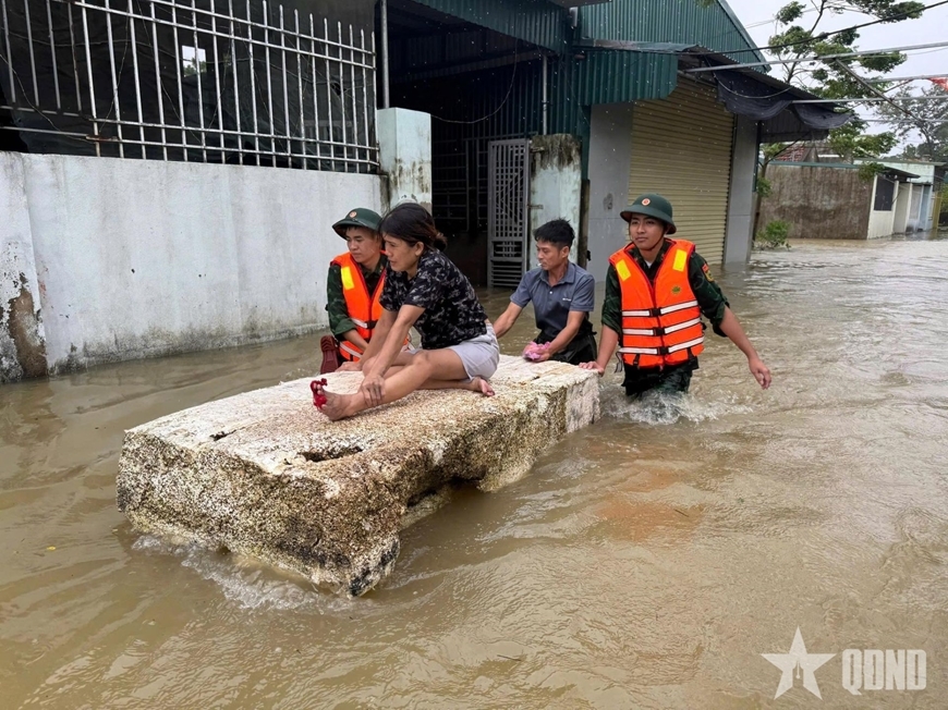 Lực lượng vũ trang tỉnh Thanh Hóa hỗ trợ người dân sơ tán ra khỏi vùng ngập lụt do bão số 10. Ảnh: KHÁNH TRÌNH