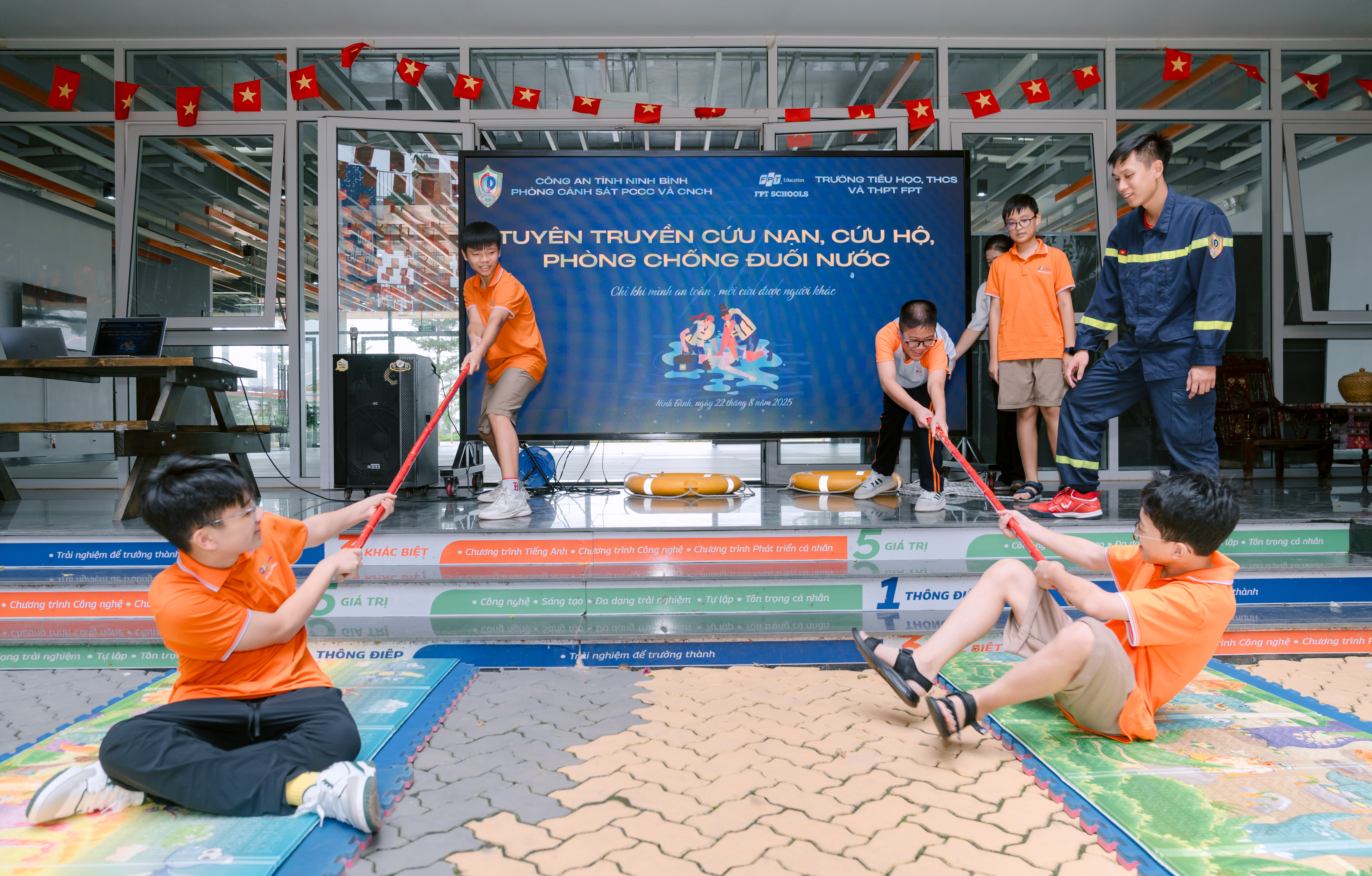 Khởi động năm học 2025-2026, Trường Tiểu học, THCS và THPT FPT Hà Nam (FPT Schools) đã tổ chức tập huấn kỹ năng cứu nạn, cứu hộ, phòng chống đuối nước và tham gia giao thông an toàn cho gần 1.300 học sinh. Chương trình có sự phối hợp trực tiếp của Phòng Cảnh sát Phòng cháy, chữa cháy và Cứu nạn, cứu hộ (PCCC & CNCH), Phòng Cảnh sát Giao thông Công an tỉnh Ninh Bình, nằm trong Tuần định hướng đầu năm học. Trong buổi tập huấn, học sinh được tiếp cận và thực hành nhiều nội dung quan trọng: nhận diện những lỗi thường gặp khi cứu người, đặc biệt là việc lao xuống nước khi chưa có kỹ năng; áp dụng các biện pháp cứu hộ gián tiếp bằng sào, áo, khăn, dây… để hỗ trợ nạn nhân; tập huấn sơ cứu ban đầu như kiểm tra hô hấp, tim mạch, hô hấp nhân tạo và tư thế hồi phục. Các hoạt động được truyền tải thông qua mini game, tình huống giả định và diễn tập thực tế, tạo hứng thú và giúp học sinh dễ nhớ, dễ áp dụng.