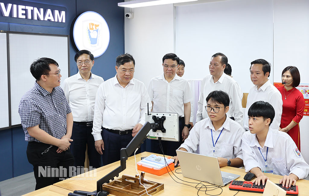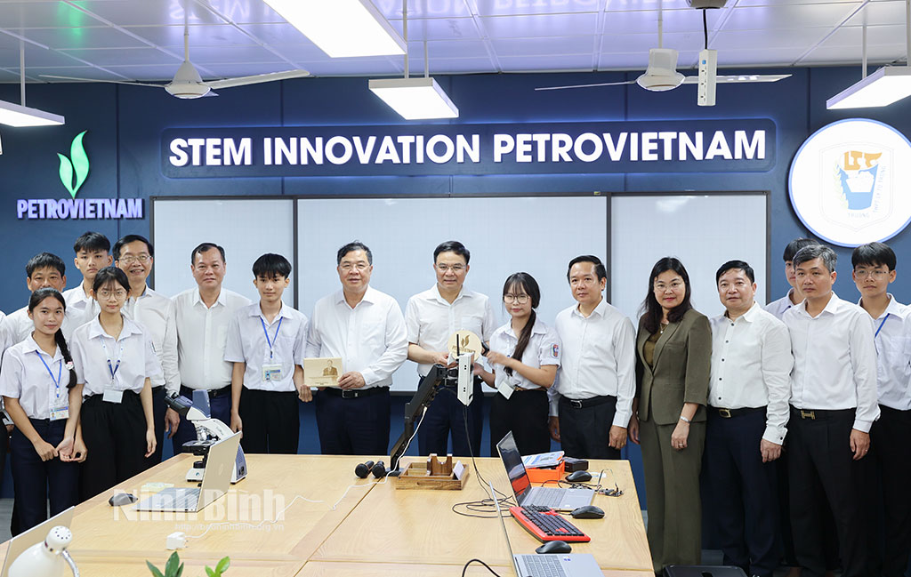 Đồng chí Phạm Gia Túc, Ủy viên Trung ương Đảng, Chánh Văn phòng Trung ương Đảng và các đồng chí lãnh đạo tỉnh, lãnh đạo Tập đoàn Công nghiệp – Năng lượng Quốc gia Việt Nam tham quan phòng học STEM.