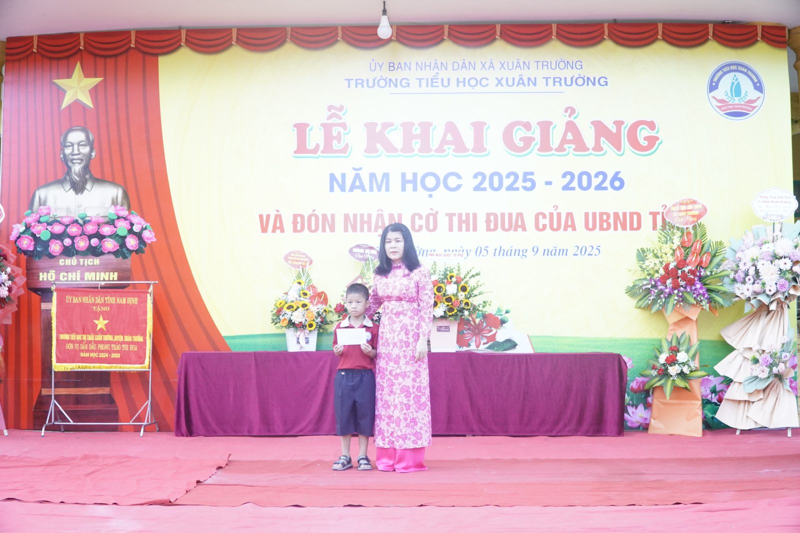Một trong những khoảnh khắc được mong chờ và xúc động nhất của buổi lễ là nghi thức chào đón 196 em học sinh lớp 1. Dưới sự dẫn dắt của các thầy cô, những “búp măng non” với gương mặt ngây thơ, trong sáng lần đầu bỡ ngỡ bước vào ngôi nhà chung trong sự chào đón nồng nhiệt của toàn trường. Cô giáo Phạm Thị Thu Hằng – Bí thư chi bộ, Hiệu trưởng nhà trường – đã ân cần trao tặng những món quà nhỏ đầy ý nghĩa cho các em, như một lời chào mừng ấm áp và yêu thương, chính thức công nhận các em là học sinh của trường Tiểu học Xuân Trường.