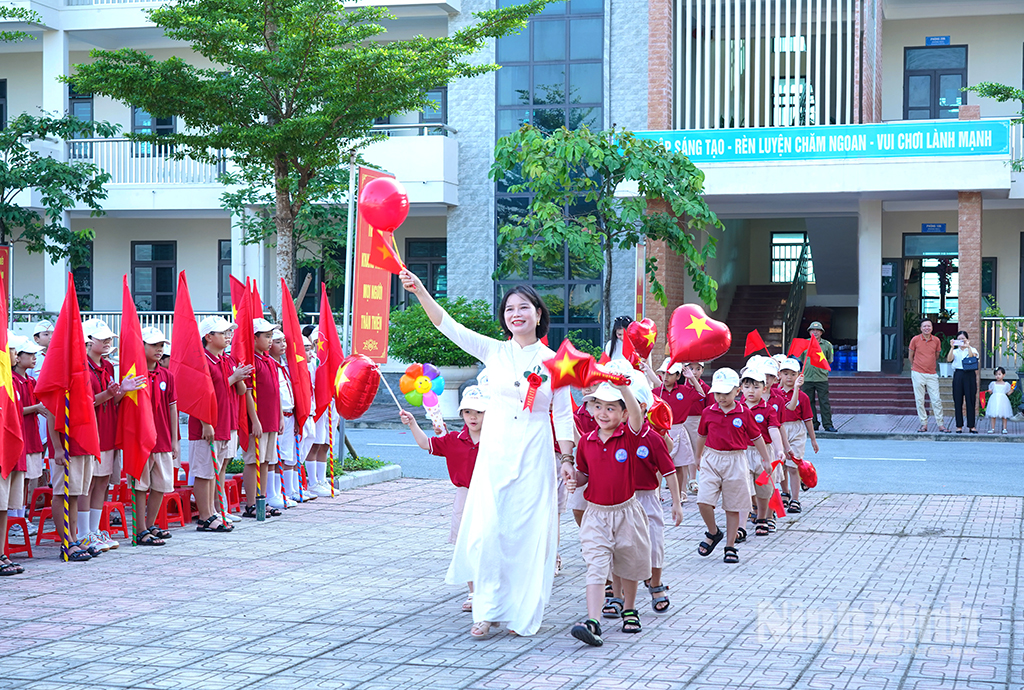Cô giáo Trường Mầm non Khánh Dương, xã Yên Mô đón học sinh đến trường trong ngày khai giảng năm học mới.