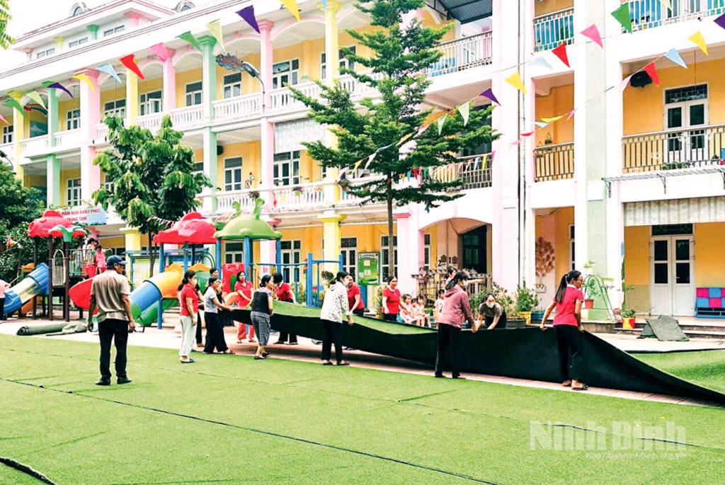 Chuẩn bị cho năm học mới, giáo viên Trường Mầm non Hoa Sen (phường Phủ Lý) chỉnh trang lại trường lớp, sẵn sàng đón học sinh đến trường. Ảnh: Minh Thuận